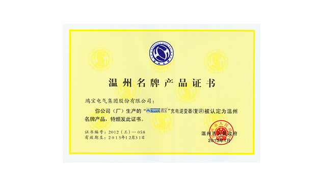 “鸿宝”牌充电逆变器再次荣获“温州名牌产品”