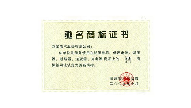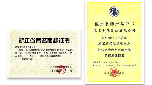 “鸿宝”牌稳压电源被温州市人民政府认定为“温州名牌”产品