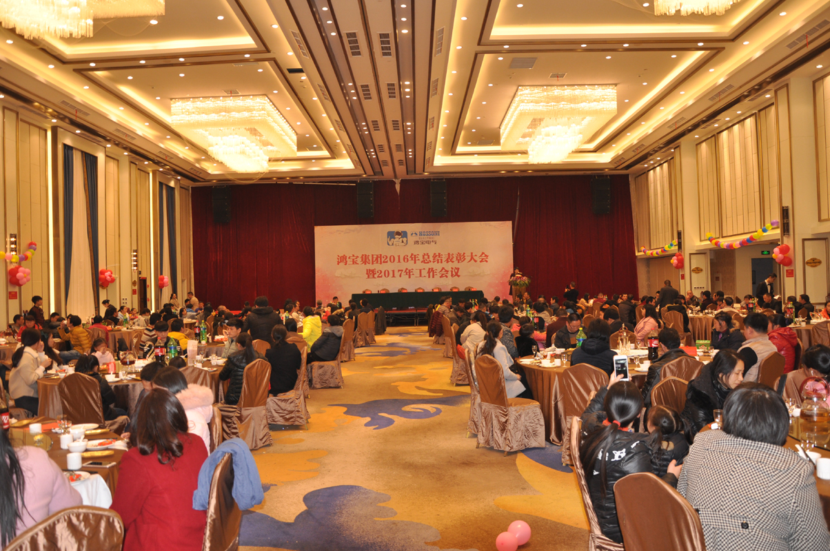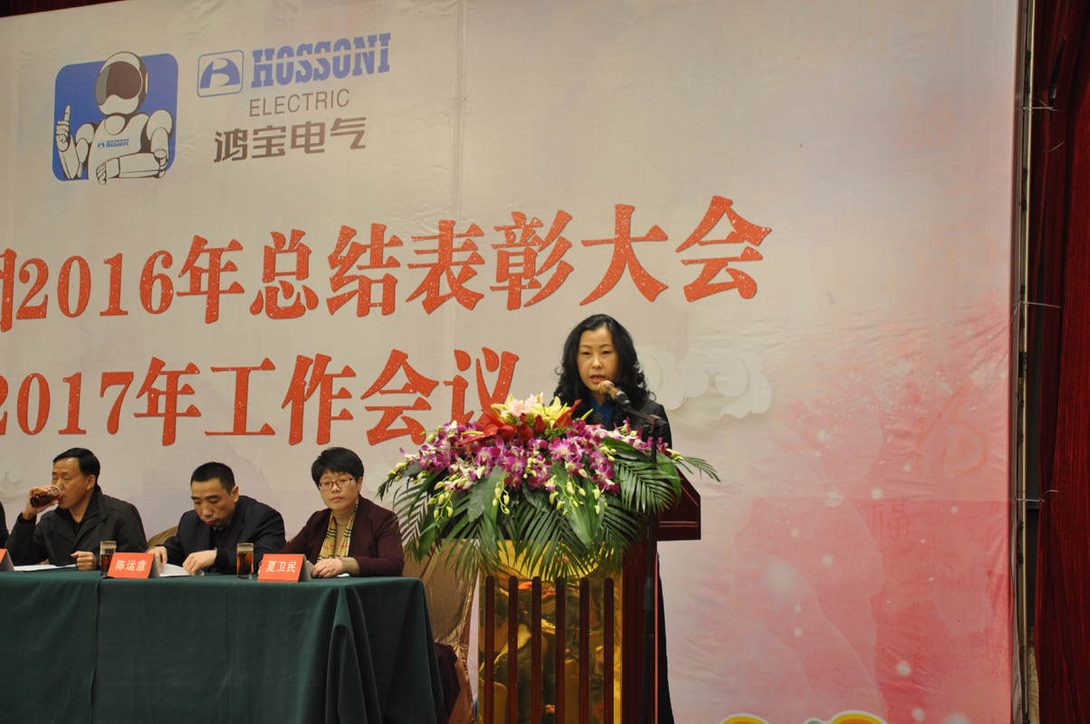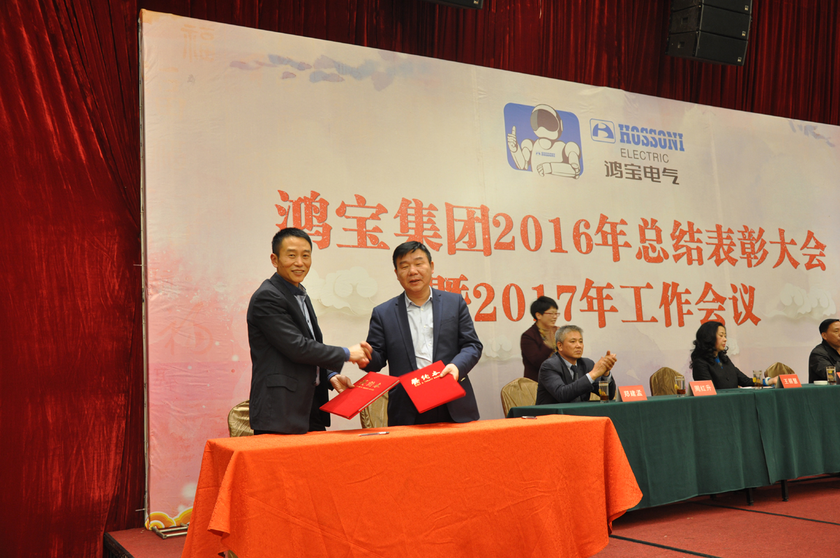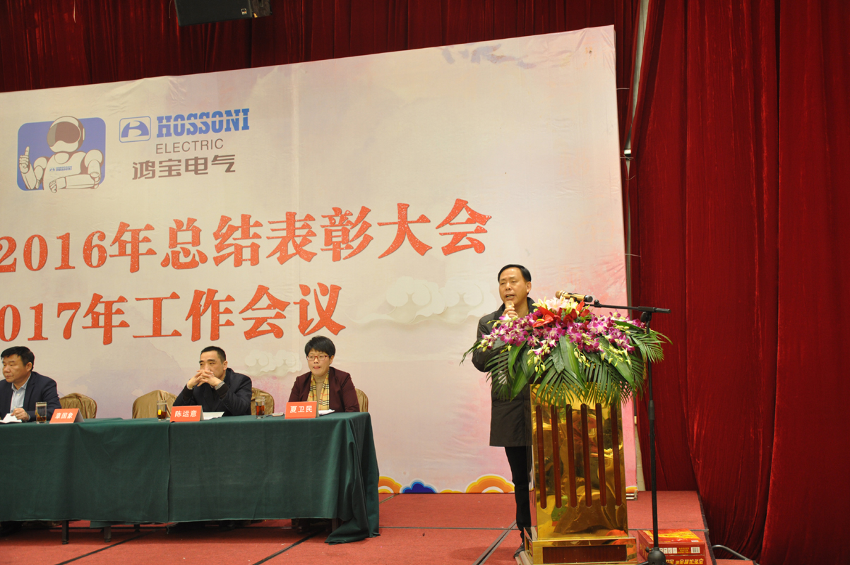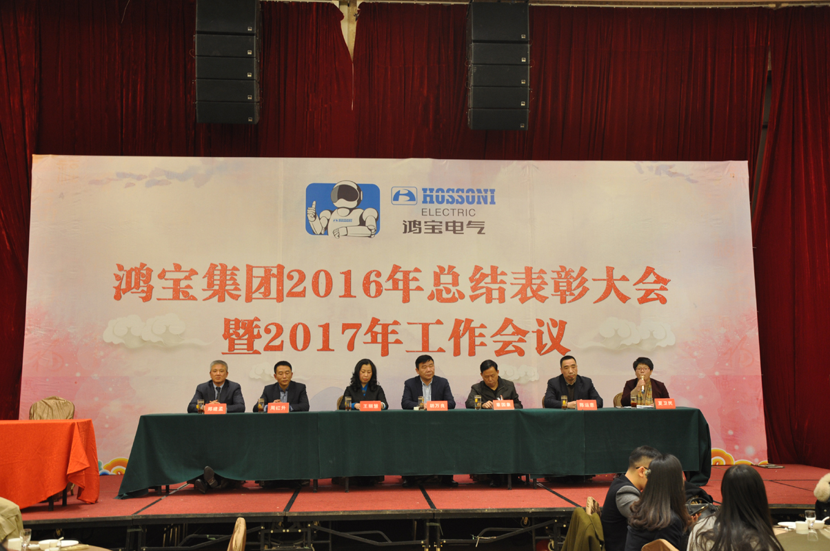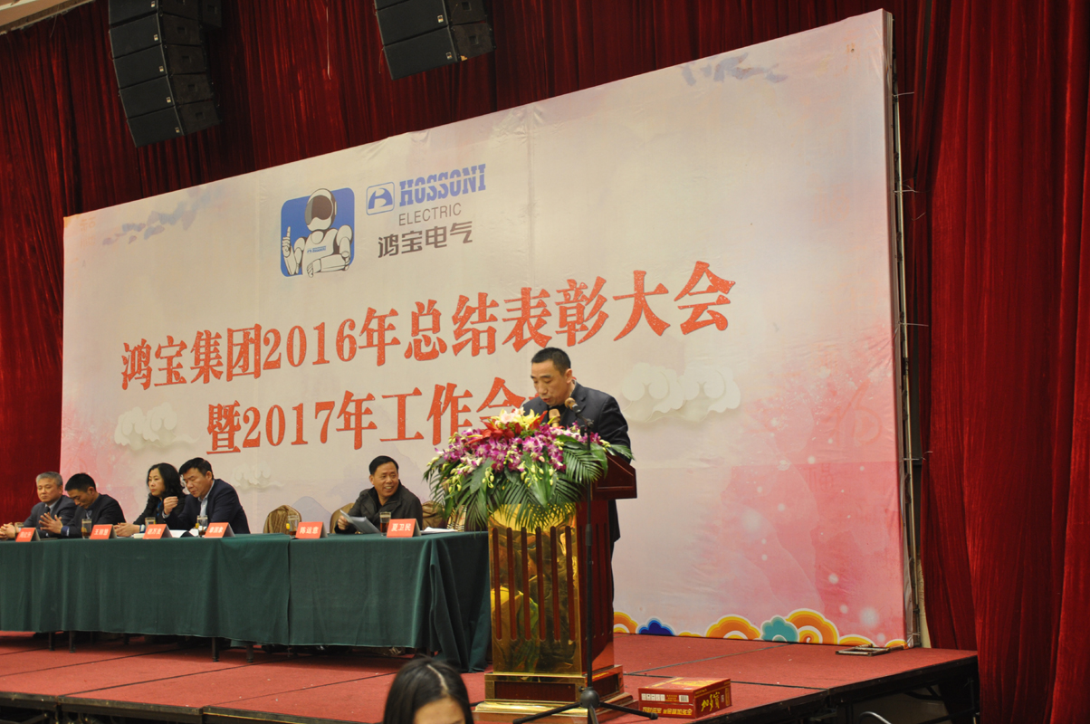 1月15日下午,鸿宝电气集团在柳市新新雅假日大酒店贵宾楼A\B厅隆重召开2016年度总结表彰大会暨2017年工作会议。出席本次会议的领导有公司董事长、总经理、副总经理、监事长、各部门主管及公司员工300余人参加会议。会议由办公室主任夏为民主持,会议在庄严神圣的国歌声中拉开了序幕,公司监事长王丽慧为大会致词,生产副总经理周红升宣读了表彰文件,公司隆重表彰了10位优秀员工,销售部陈莲莲和党员郑永忠代表优秀员工和优秀党员做了发言,技术副总经理陈运意就如何提升产品质量做了详细的质量报告,总经理章国象认真客观地总结了公司2016年的工作取得的成绩和荣誉,并提出了2017年工作目标和计划。会议上董事长胡万良分别与生产副总经理周红升、技术副总经理陈运意和销售代表陈莲莲分别签订了安全生产管理协议、质量管理协议和销售考核协议。最后董事长胡万良作了重要讲话,他对集团公司2016年的工作做了具体的评价,并指出2016年,我们面对世界经济疲软,国内外市场复杂严峻等不利因素,全体员工团结一致,不断进取,逆势而上,保持了企业平稳发展。同时,胡董提出:在新的一年, 全体员工要做到不因成绩而骄傲,不因挫折而气馁,我们要有同一个信念,目标一致,做到有目标、有计划、有实施、有检查、有监督、有结果,他对大会提出了七点意见和要求,他指出全体员工要以百折不挠的精神从团队合作、提高生产效率、狠抓产品质量、全力开拓新市场等方面要求员工坚定信心,团结一致,攻坚克难,再创鸿宝新的辉煌。