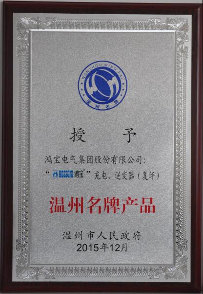 本报讯: 鸿宝公司全体员工在鸿宝集团董事会的正确指导下,齐心协力改进产品质量,提升产品品质,获得广大消费者好评,于2015年12月,“”牌充电、逆变器(复评)被温州市人民政府认定为温名牌产品。